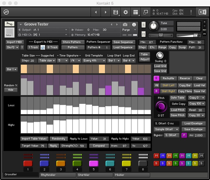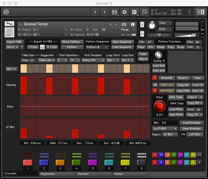 The Groovifier is a Kontakt 5/6 instrument. It is essentially an eight-part rhythm machine with a pattern sequencer. Each pattern of the Groovifier can play up to 32 different sounds (that's four sounds per part). The Groovifier stores 100 distinct patterns, and it can play back a 200-pattern sequence. Each pattern can be up to four bars long.