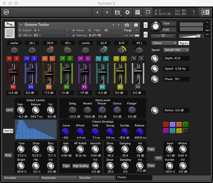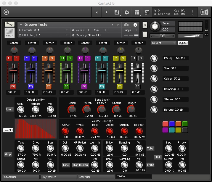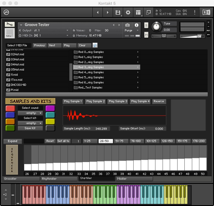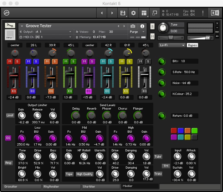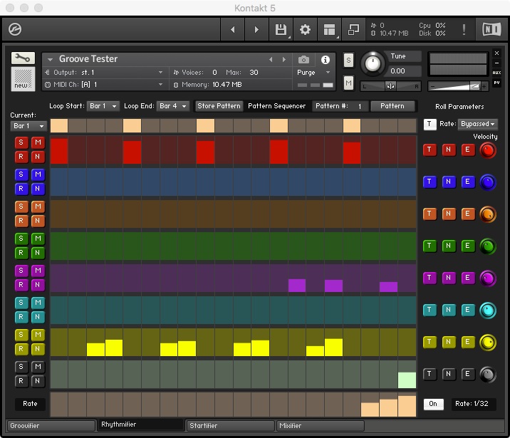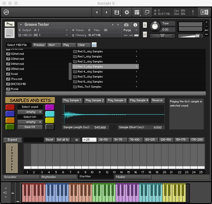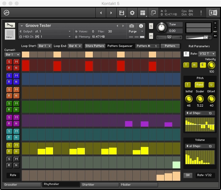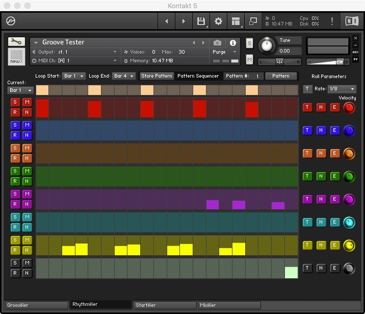 The Groovifier makes use of round-robin iteration among samples (actually, between groups) during playback. By making use of several Kontakt features, it employs dynamically recorded multi-sampled sounds for providing the user with a more realistic and musically playable experience.